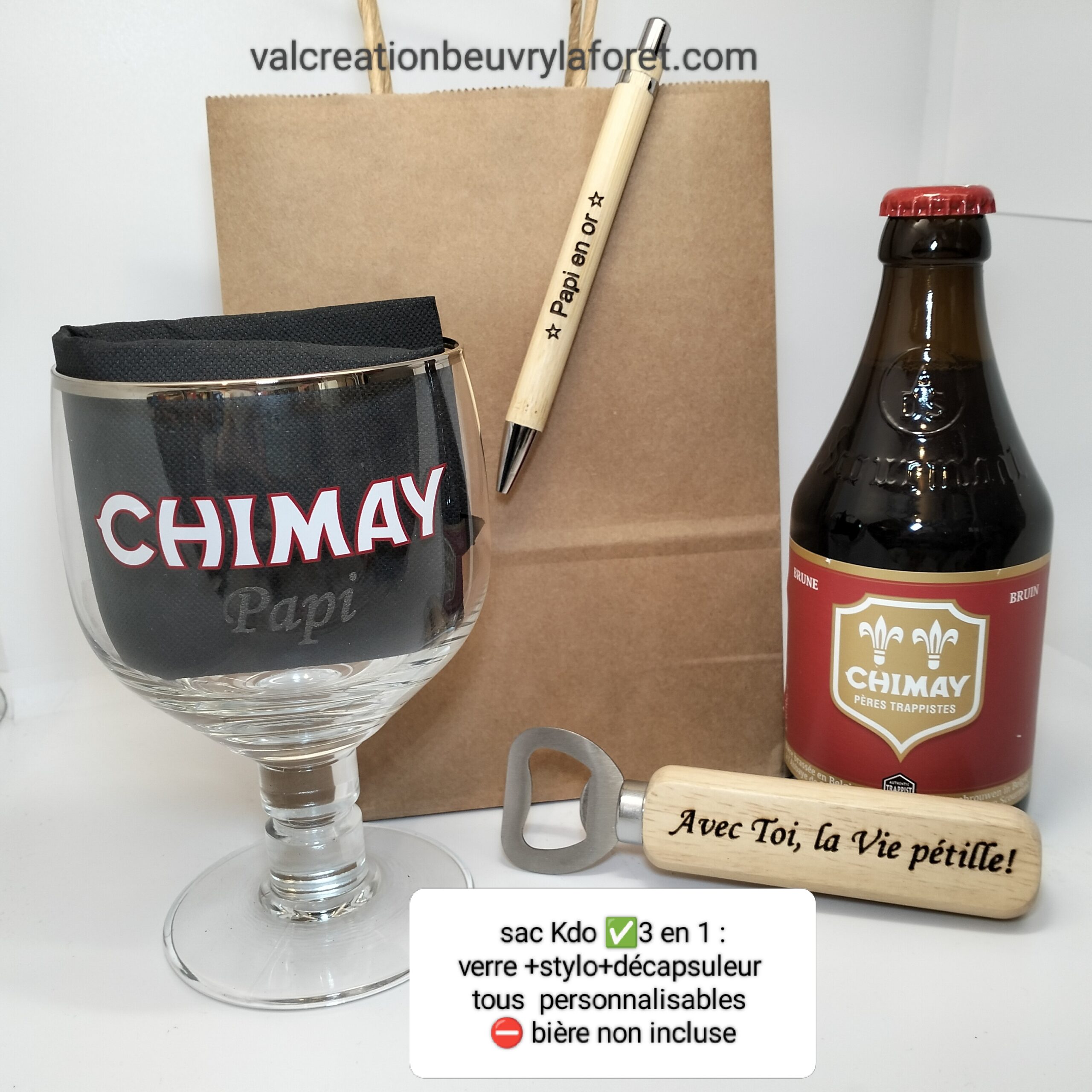 sac kdo verre chimay prénom+ stylo personnalisé+décapsuleur bois personnalisable papi fête des papis